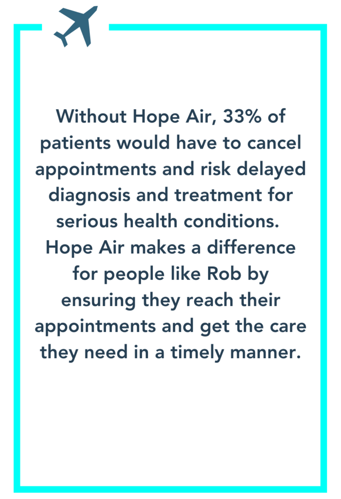 Mais avec le coût imminent de son voyage, Rob devait trouver un moyen de se rendre à Vancouver. Avec moins d'une semaine pour planifier son voyage, Rob n'avait d'autre choix que de réserver ses billets d'avion et son hébergement avec sa carte de crédit. Il était néanmoins ravi de pouvoir enfin se faire soigner, car il attendait depuis si longtemps. Rob a partagé cette bonne nouvelle avec toute sa famille et ses amis lorsqu'il a reçu un appel de l'un d'entre eux, qui lui a raconté son expérience avec Hope Air. « Les petites choses font les grandes joies. Mon amie m'a finalement recommandé Hope Air et m'a dit : « Ils ont été une véritable bénédiction pour moi en décembre dernier. » », raconte Rob.