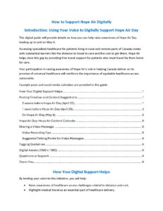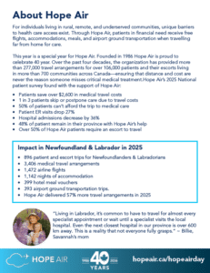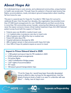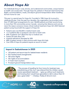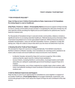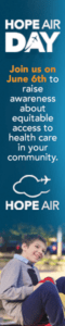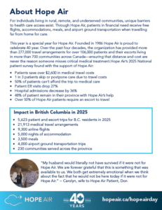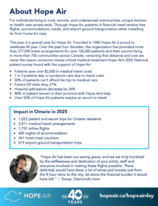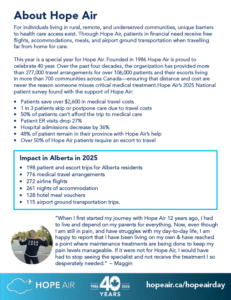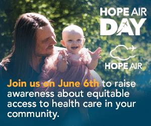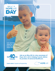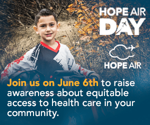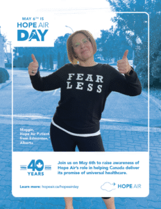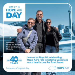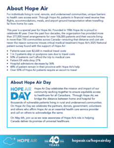 Welcome to the Hope Air Day Resource Hub. On this page you will find all the tools you need to share Hope Air Day with your community. You’ll find every thing from posters, to social media posts, digital website assets and background information about Hope Air and the patients we serve. Ways your community can get involved: