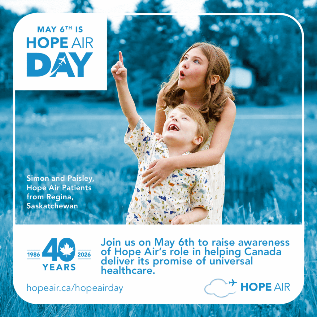 Hope Air Day celebrates the mission and impact of our community working together to ensure equitable access to healthcare for all Canadians.  Through Hope Air, we bridge the distance between home and hospital for thousands of vulnerable patients living in rural and underserved communities. On Hope Air Day we celebrate the partners, donors, government, volunteers and others who affirm Hope Air as an essential health care service provider and call on others to acknowledge the same.